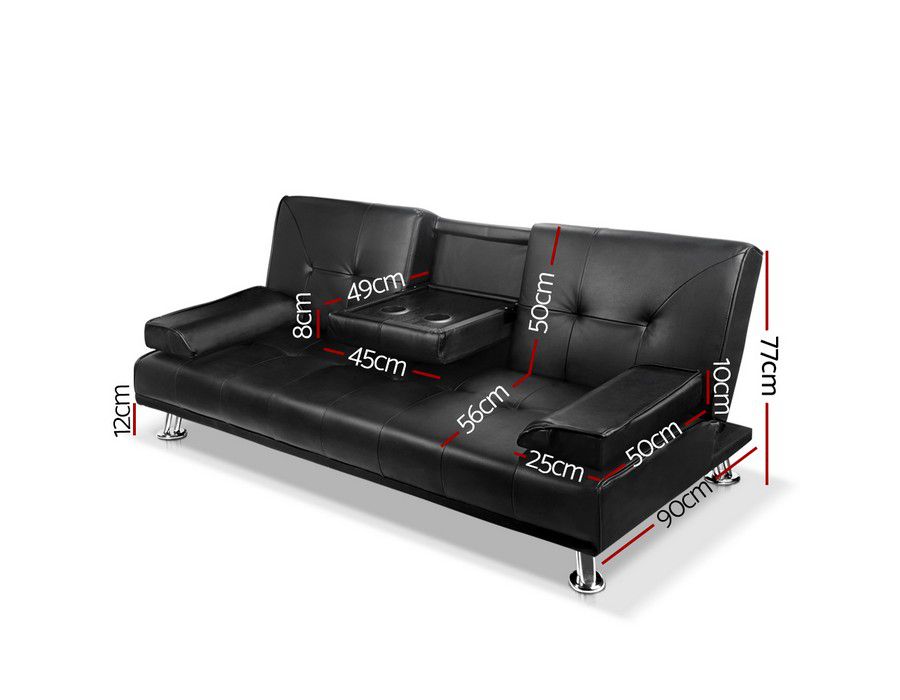 First up the middle backrest actually folds down to reveal two convenient cup holders. Two drinks close at hand is better than them being one metre away we would gladly say. And when having a few drinks is beginning to take its effect and you are clamouring for a lie-down just tilt back the sofa backrest and convert it instantly into a faux leather sofa bed. At 1.88m long and 1.08m wide the sofa bed should be more than accommodating.